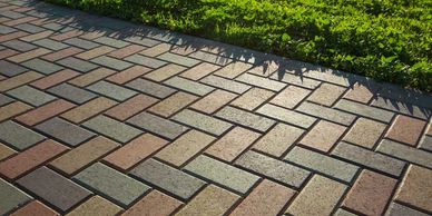 The pavers are compacted into 1” of bedding sand to begin interlocking. Regular or polymeric sand is swept into paver area joints, enhancing interlocking. Polymeric sand, which acts like a flexible grout, is highly recommended to prevent weed growth and insect infiltration. The pavers receive final compaction with a plate compactor to ensure the sand fills the joints. If using Polymeric sand, we apply water to activate the hardening process.